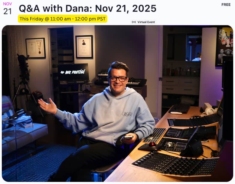29 days ago • 1 min readHey Reader! Quick heads up: I’m hosting a free, super-casual Home Studio Q&A this Friday at 11am Pacific, and I’d love for you to join me. No sales pitch. Just a fun hang with a bunch of music-makers. 👉 RSVP Here If we haven’t connected in a while — hi! I’m Dana, a Grammy-nominated mixer/producer who loves helping home-studio musicians level-up. I’ve worked with artists like Bob Dylan, Justin Bieber, and The Avett Brothers, and I get a TON of questions about how to make great-sounding records...